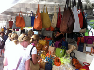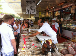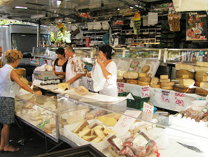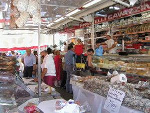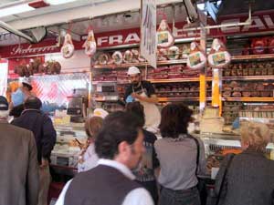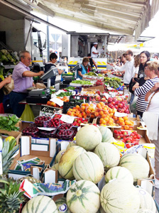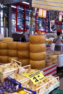 Der Wochenmarkt ist ihre Speisekammer. Er bietet mit seiner Vielfalt an Obst, Gemüsen, Fisch und Fleisch alles was in den Küchen als Zutaten gewünscht wird. Bergeweise türmen sich neben Glas- und Töpferwaren grüne Äpfel, gelbe Aprikosen und rote Tomaten. Und in der Nachbarschaft zu Textilien und Lederwaren hängen aufgereiht Schinken und Würste. Der würzige Duft zahlreicher Käsesorten durchzieht die engen Marktwege, auf denen sich jeden Tag an einem anderen Ort Scharen von Menschen zwängen. Die farbigen Buden, Zelte und Schirme, die ständig woanders aufgestellt werden, haben an Anziehungskraft nicht verloren und sind ein attraktiver Treffpunkt.